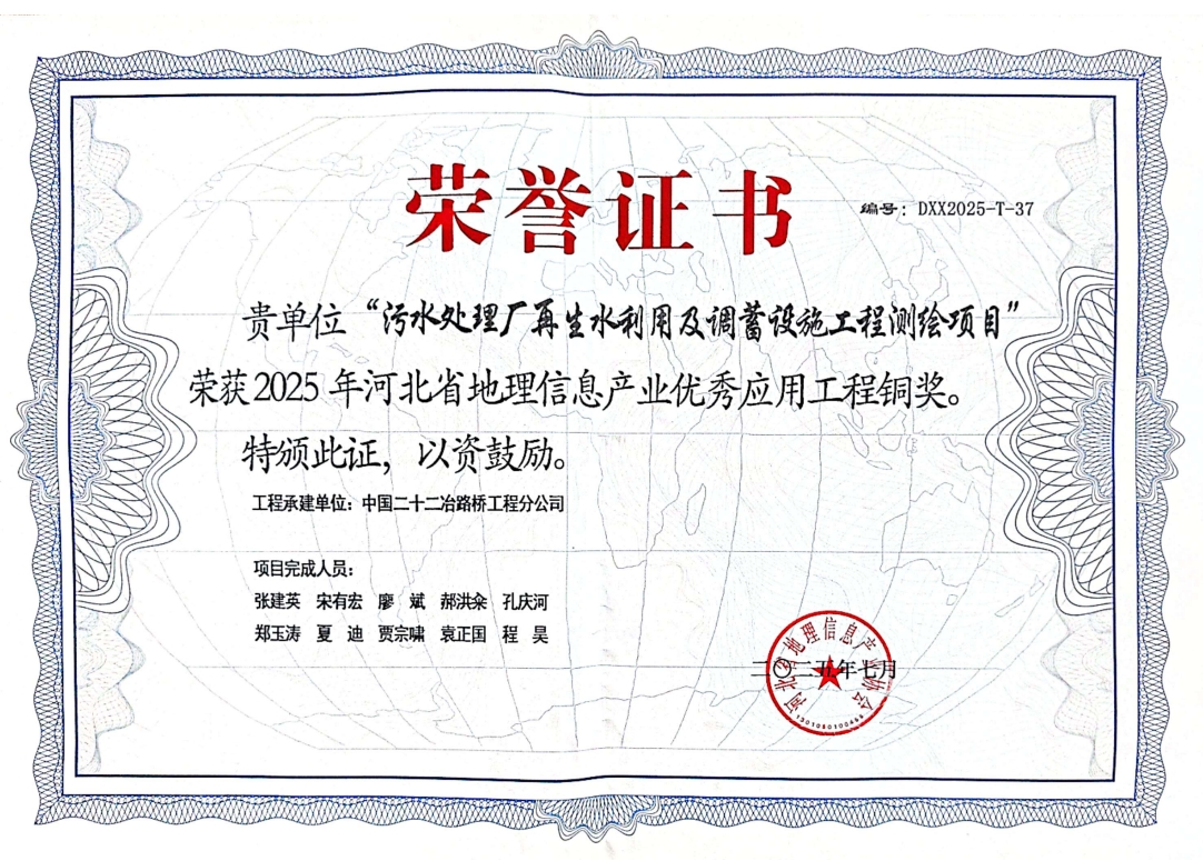 近日獲悉,在河北省地理信息產業(yè)協(xié)會主辦的權威評選中,路橋公司憑借“污水處理廠再生水利用及調蓄設施工程測繪項目”的卓越實踐,榮獲“2025年河北省地理信息產業(yè)優(yōu)秀應用工程銅獎”。